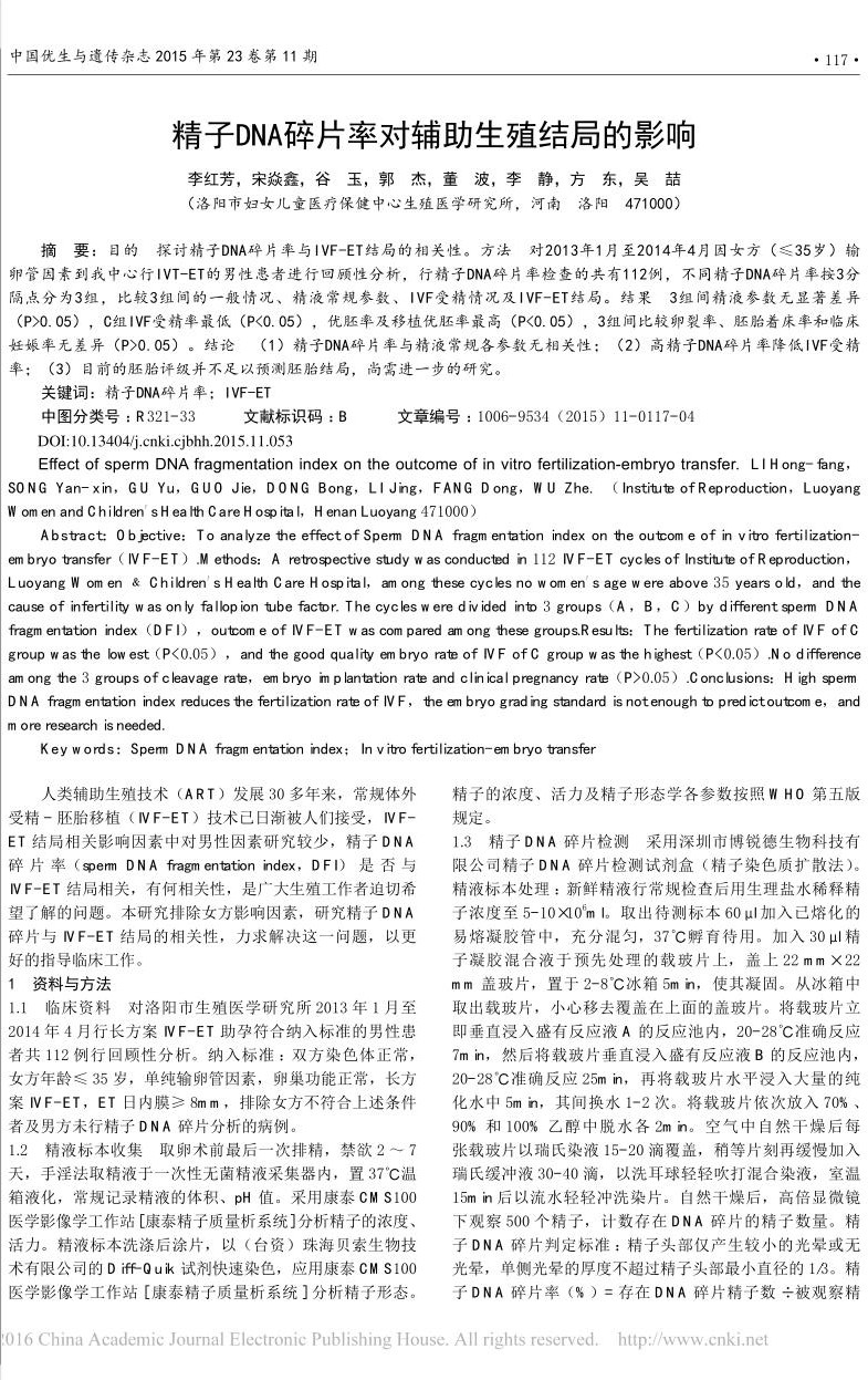 精子DNA碎片率对辅助生殖结局的影响-李红芳